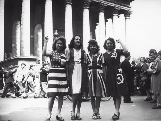 А сейчас мы в центре внимания публики на Елисейских Полях. Мы, четыре подружки из парижского предместья, в платьях цветов флагов Америки, Франции, Великобритании, Советского Союза — сделали это! Мы победили.
